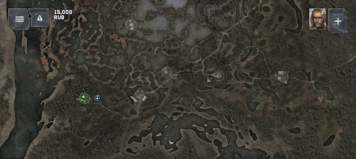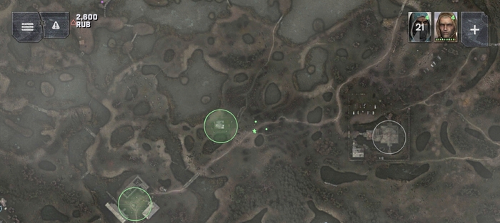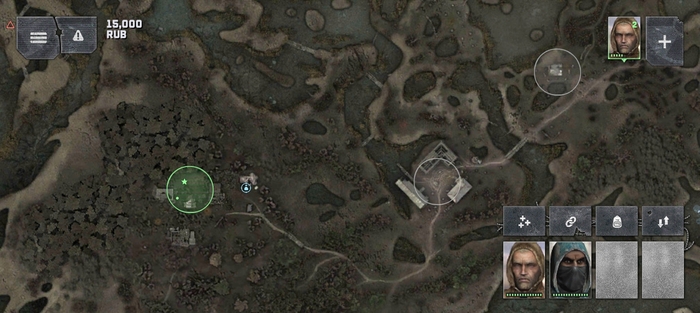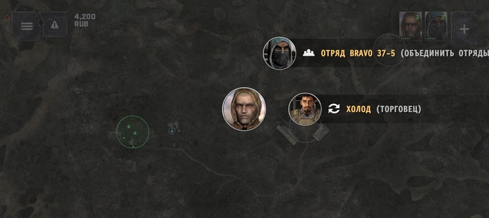 Дальше создав отряд, мы нажимаем на кнопку, где указаны две стрелки, эта кнопка отвечает за всякие интересные места: разговор с торговцем, отрядом своим, сдачей заданий от других группировок и поиск тайников.