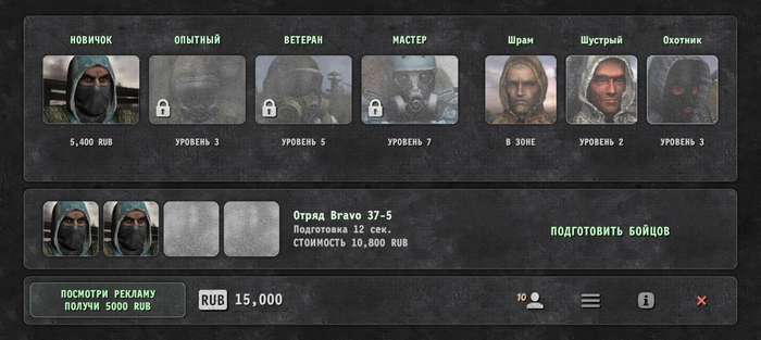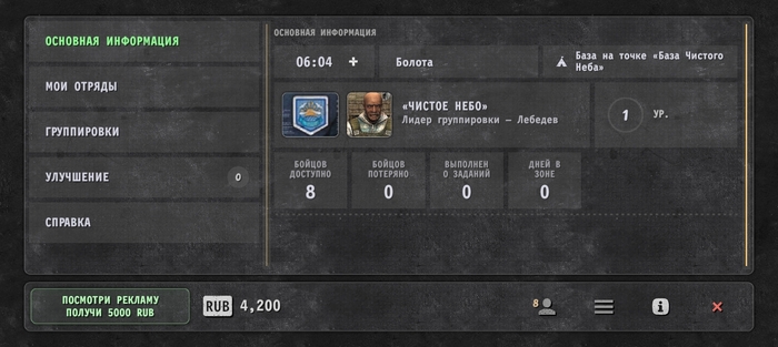 А вот и тот момент, когда бойца можно улучшить, с поднятием до третьего уровня группировки, каждого можно улучшить за деньги. Которые зарабатываются с помощью боёв с другими группировками, поиском артефактов и их продажи, а так же, с помощью выполнения заданий других группировок.