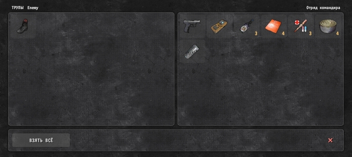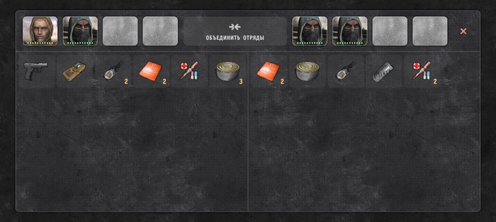 Нажав на свой второй отряд, мы можем обменяться припасами: медициной, едой, оружием, артами и прочим.
