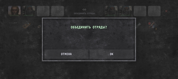 Так же, нажав на отряд, можно как, быстро подлечить их, не заходя в рюкзак, так же, нажав на знак цепи у нескольких отрядов сразу, вы можете одному приказать двигаться в точку и второй пойдёт с ним. Удобно когда отрядов становится очень много под конец игры, а каждым по одиночке управлять муторно =|.