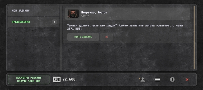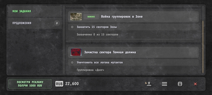 К примеру, вот пришло задание от Долга, на зачистку логова мутантов. До него нужно добраться, нажать рядом с ним на кнопку со стрелками, когда рядом с логовом отряд. Само логово подрывают, а задание сдаётся заказчику. Дальше, денежки на счету и все довольны :)