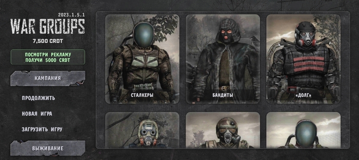 В игре, есть следующие группировки: Сталкеры, Бандиты, Долг, Свобода, Военные, Монолит, Чистое небо, Экологи, Ренегаты, Наёмники, О-сознание и создание своей собственной группировки (которая создаётся за игровую валюту, которая фармится с помощью просмотра рекламы (На данный момент, по другому фармить валюту, я лично не увидел как :-| ).