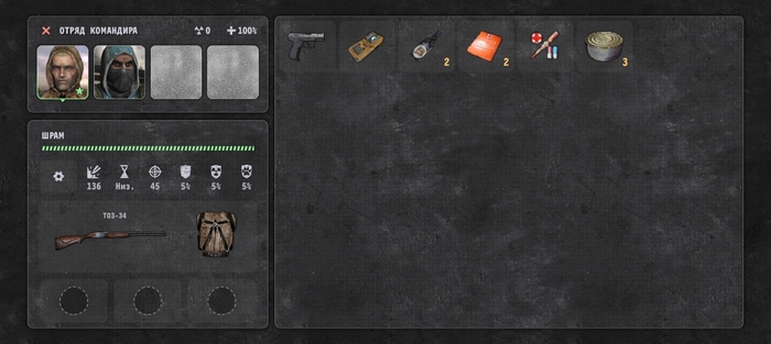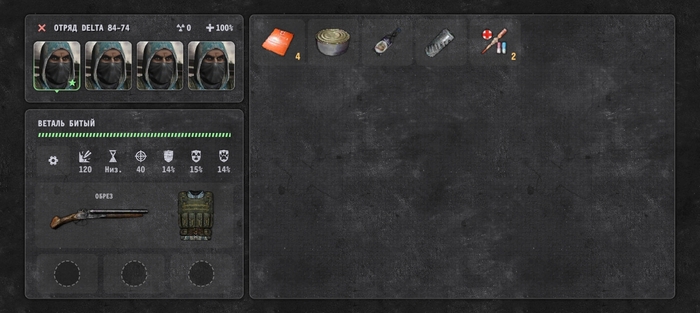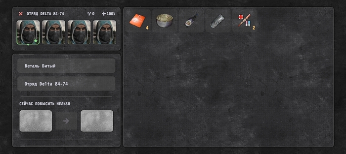 Дальше мы нажимаем на отряд, нажимаем на рюкзак и видим содержимое отряда: еда, медицина, оружие. Вообще всё что есть у него, а так же, сколько человек в отряде, их вооружение, броню, сколько у них хп. Так же можно прокачивать своих товарищей нажав на шестерёнку.