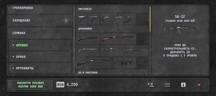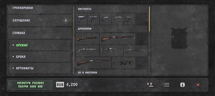 Дальше идёт справка где мы можем узнать информацию об оружии, броне и артефактах, которые есть в игре.