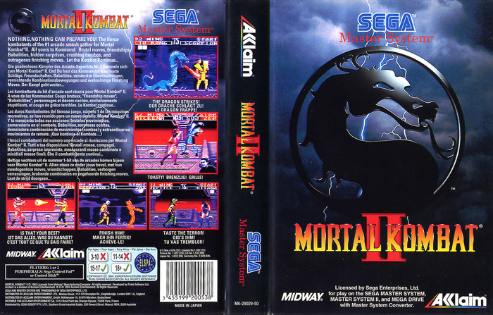 Вторая часть МК для меня самая любимая в оригинальной трилогии. От неё прям так и веет злым тёмным фэнтези. Куча секретных персонажей - аж 3, в отличии от первой части. + по целому фаталити, теперь аж целых. Теперь 3 добивания на арене. Не зря в промо видео была фраза "больше". Добавили безобидное завершение поединка - Френдшип. Ну и самое ужасное - сделать оппонента ребенком и заставить прожить жизнь по новой, ещё раз. В статье будут разные обложки версий игры и набор видео игрового процесса из них. Заварите чаёк, путешествие будет долгим!.