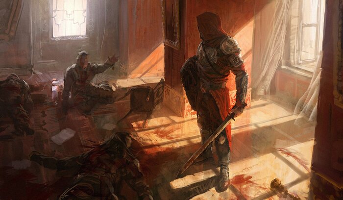 Отбивая удар за ударом я словно голодный волк кручусь вокруг своей добычи пока противники в своих тяжёлых доспехах не начинают краснеть от усталости. Пот градом стекает по их смуглым лицам и конечно они совершают одну глупую ошибку следом за другой. И опять ярко-красная кровь потоками расплескивается по коридору без единого живого стражника.