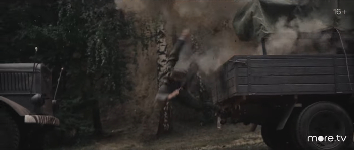 0:44 – падение от взрыва.