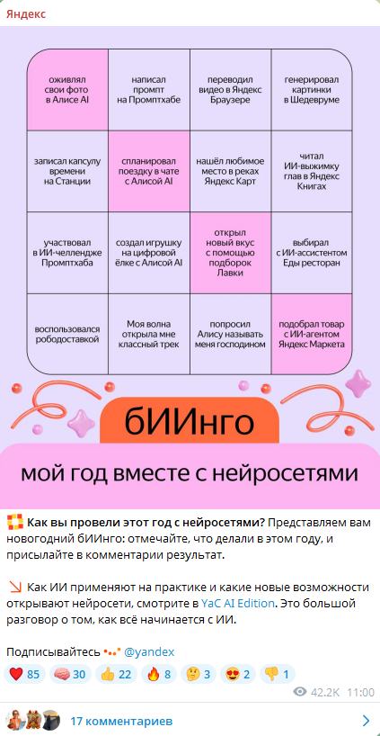 Предложили подписчикам сыграть в БИИнго (игра слов кстати слабовато считывается) с довольно сложной механикой: нужно забрать картинку, что-то там отметить и отправить ее в комменты. Задачу выполнили только самые мотивированные друзья эсэмэмщика.