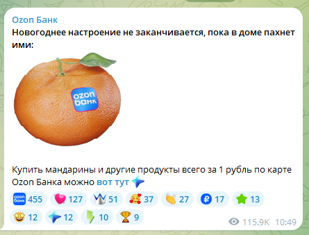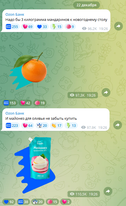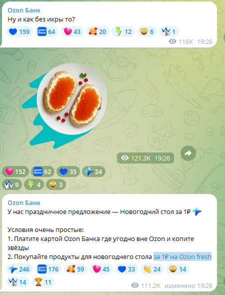 Придумали новогоднее промо — «Новогодний стол за 1 рубль» и пушили его за пару недель до Нового года. Кидали стикеры с продуктами, которые можно было купить за 1 рубль на Ozon fresh.