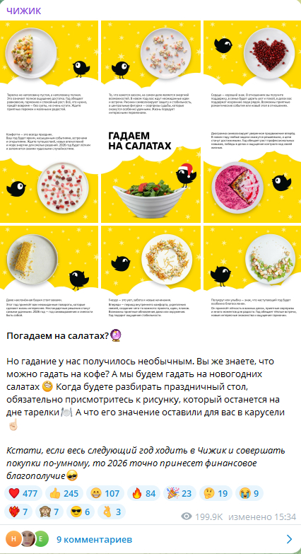 Гадали на салатах. Про салаты шутили многие, но тут прикольно заморочились по тексту. Креативно, с юмором, по-доброму. Обычно в канале публикуют скидки и акции, а тут никаких товаров — чисто по-приколу, повеселили подписчиков.
