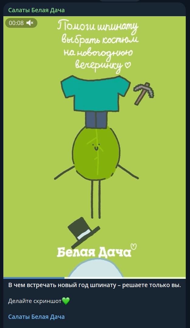 Одушевили шпинат и предложили подписчикам выбрать ему наряд на вечеринку. Клевый интерактив, где надо вовремя остановить видео, чтобы шпинат оказался в одежде. Можно захватить читателя на пару минут. Это еще и по пабликам разлетелось.