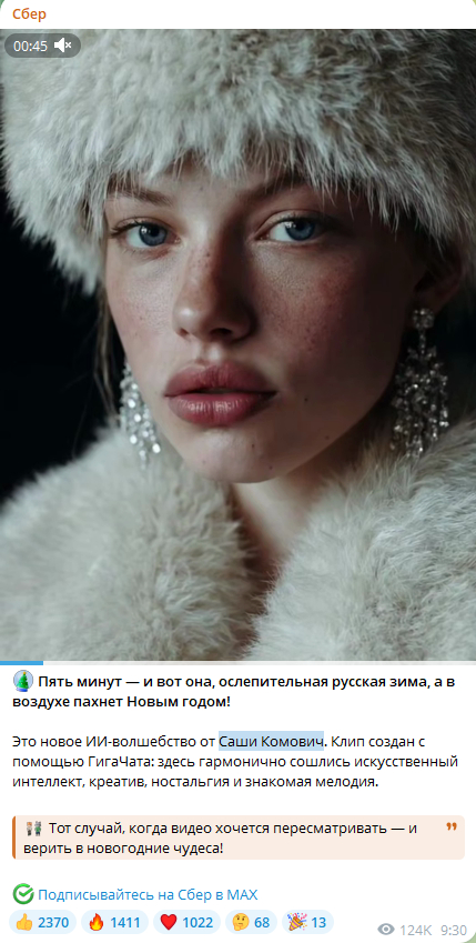 Заколлабились с Сашей Комович и опубликовали клип, сгенерированный в ГигаЧате по мотивам хита 50-х про пять минут.