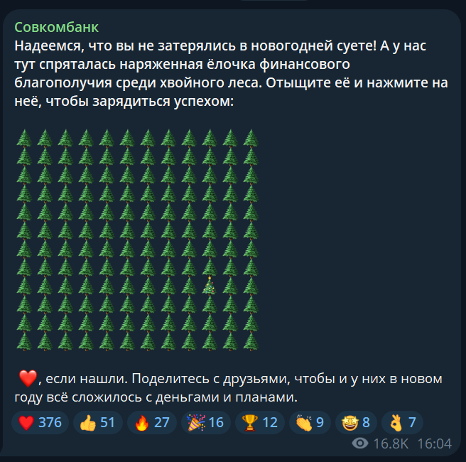 Кто сказал, что креативный контент должен быть сложным и дорогим? Иногда можно вовлечь читателей вот такой развлекухой с поиском елочки. Я кстати нашел быстро, потому что смотрел с компа. С телефона можно удержать так читателя минут на пять.