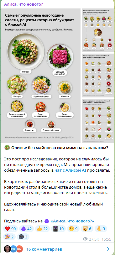 Еще про салаты. Тут рассказали, какие салаты пользователи чаще всего обсуждают с Алисой, какие ингредиенты хотят убрать, какие — добавить.
