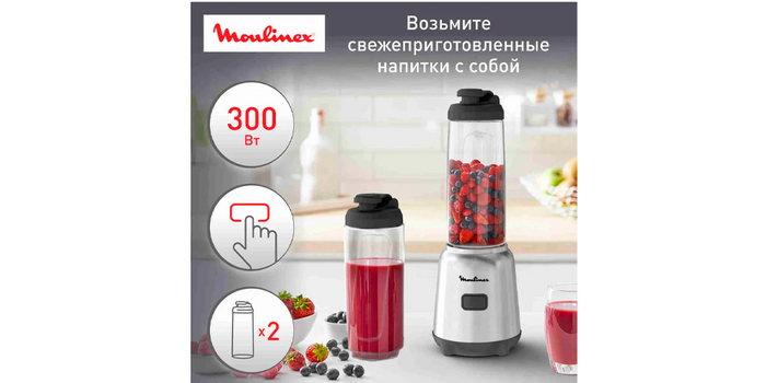 На четвертой строчке расположился Moulinex Mix & Move LM15FD10 – блендер в комфортном форм-факторе для смешивания напитков и смузи. Он представляет собой узкий рабочий блок, съемную систему из 4 ножей для простой очистки и две бутылки из высококачественного тритана по 0,6 л каждая. Смешивание происходит непосредственно в бутылках, а для удобства переноса к ним идут крышки с поилкой и герметичной фиксацией.