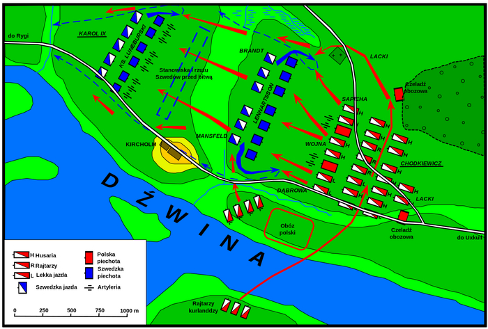 Шведы имели большое численное превосходство: 13 500 человек (11 тыс. пехоты и 2500 кавалеристов) против около 4500 человек у поляков (2500 крылатых гусар, 1300 пехотинцев, а также несколько сотен татарских всадников и казаков). Перед битвой оба войска заняли оборонительные позиции. Шведы расположились на холме с опорой левого фланга на болотистую местность, а правого — на холм и деревню Кирхгольм. Войско Ходкевича встало на противоположном холме, опираясь на свой укреплённый лагерь над р. Двиной. Противников разделяло около 1,5 км поля, которое делило высохшее старое русло Двины с небольшим ручьём.