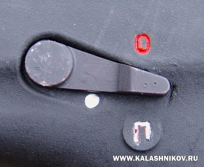 Алгоритм работы флажка предохранителя (на фотографии справа) являет собой образец нелогичности. При нанесении цветовой маркировки положений предохранителя в оружейном мире принято, что элемент управления (в данном случае флажок) либо однозначно указывает на марку соответствующего цвета («красный» – предохранитель выключен, «белый» – предохранитель включён, выстрел невозможен), либо перекрывает не актуальную в данном положении марку (видишь «красное» – огонь, «белое» – на предохранителе). Такое впечатление, что разработчик этого узла всю жизнь избегал общения с нормальным оружием, а теперь изобретает велосипед на квадратных колёсах. Фото Михаила Дегтярёва