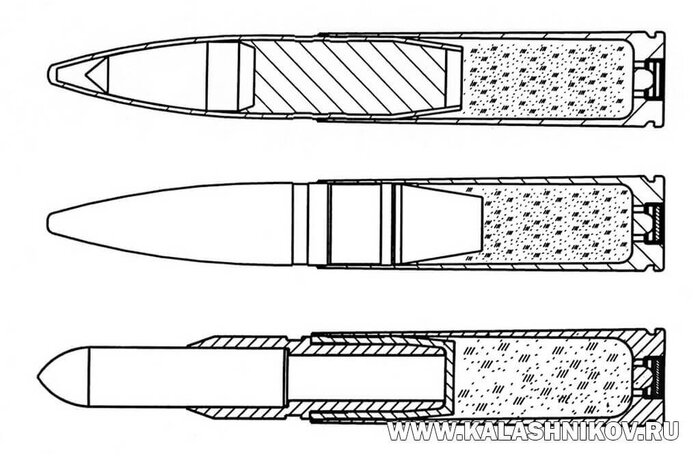 Сверху вниз. Патроны СЦ-130 ПТ, СЦ-130 ПТ2 и СЦ-130 ВПС. Их устройство понятно из приведённых схем. Замечу лишь, что патроны 12,7х55 сконструированы на базе укороченной до 55 мм гильзы патрона .338 Lapua Magnum и его ближайшим родственником является американский патрон .510 Whisper, также использующий подрезанную до 48 мм гильзу .338 LM