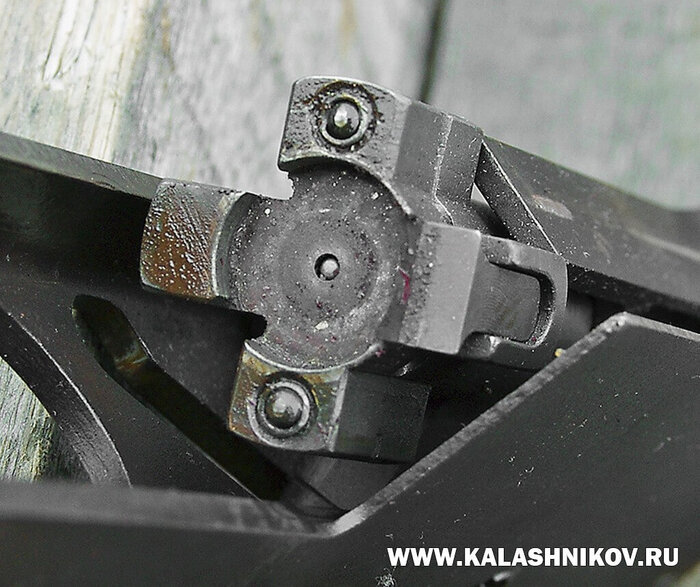 Подпружиненные гнетки, выступающие из передних торцов двух боевых упоров, видимо призваны обеспечить единообразие зеркального зазора. В запертом положении они отжимают затвор назад, обеспечивая плотное прилегание поверхностей боевых упоров друг к другу. Скорее всего, необходимость наличия такого механизма обусловлена недостаточной стабильностью базирования патрона в патроннике упором переднего торца гильзы. Фото Михаила Дегтярёва