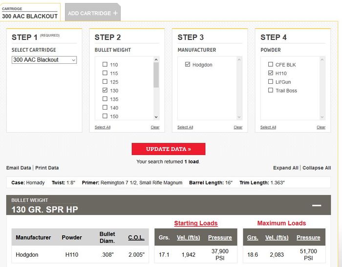 Самое время определиться с навеской. На сайте производителя пороха ввожу калибр, вес пули в 150 гран и тип пороха и получаю начальную и максимальную навеску пороха. Минимальная навеска 14,6 гран, максимальная 17,2 грана.