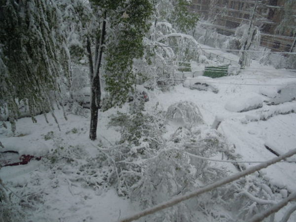 Из-за снега начали падать ветки и деревья.Некоторые дома остались без света .Большие ветки и упавшие деревья почти везде а общественный транспорт не работает .Прям хоть фильм катастрофу снимай XD.И это все длится уже 2-ой день.