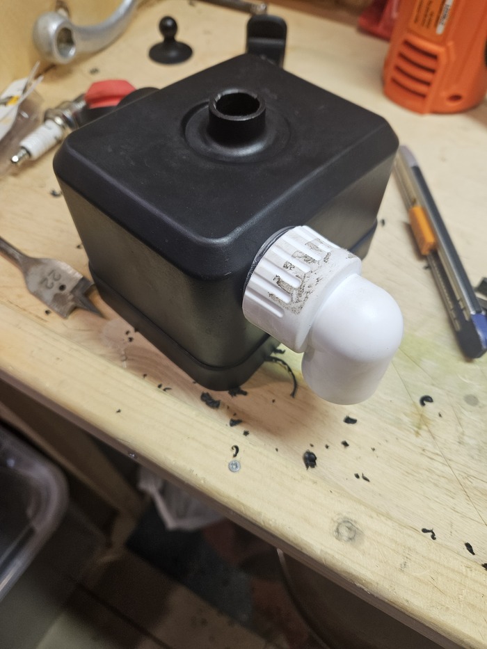 Разбираем для начала кожух воздушного фильтра и высверливаем отверстие, в которое вкручиваем уголок 90° пп трубы