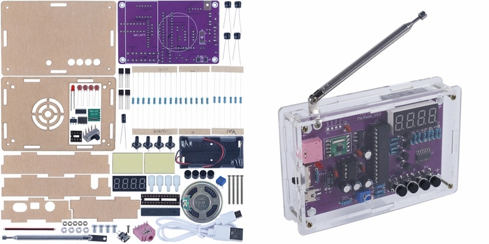 Набор для сборки и пайки беспроводного стерео FM радиоприёмника 87-108 Мгц. В наборе множество различных электронных компонентов: резисторов, конденсаторов, транзисторов, разъем для наушников, кнопок и т. д. ссылка на наборчик.