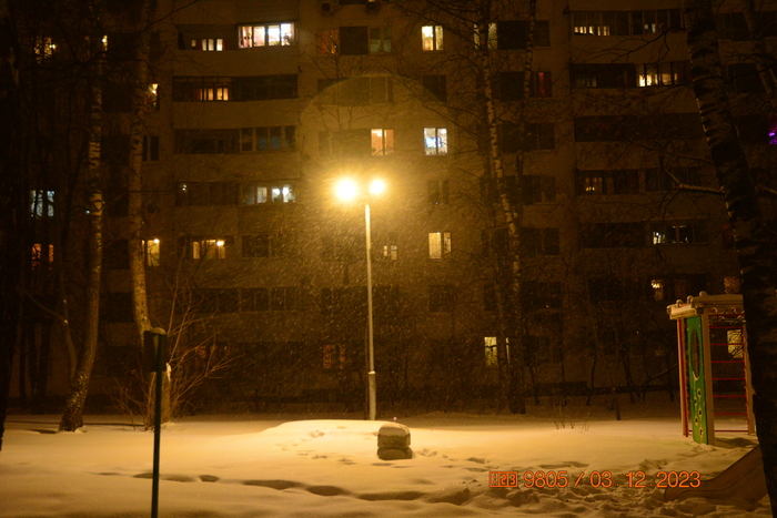 Вчера вечером случилась у нас метель. Мириады снежинок крутили вальс в воздухе, а видимость сократилась метров до двухсот. Жена попросила сфотографировать эту красоту и я, сделав несколько пробных кадров, понял, что задача довольно нетривиальна: снежинок на фото не видно, всё просто как будто в тумане. После некоторых экспериментов удалось добиться желаемого эффекта при помощи вспышки в режиме стробоскопа.