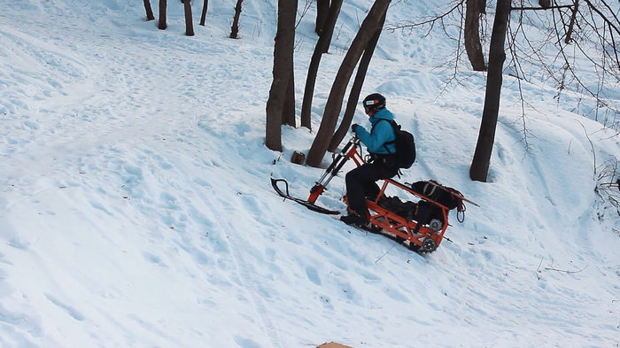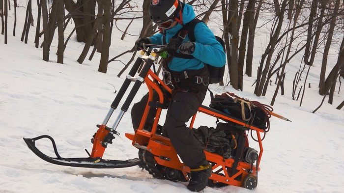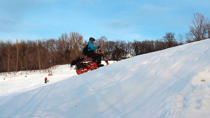 - проезжать поперек склона не опрокидываясь, поскольку гусеница узкая и всего одна лыжа.