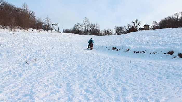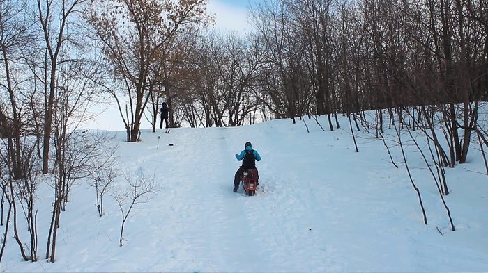 Тестировать поехали на небольшие горки, но искали максимально сложные подъемы, чтобы оценить все пределы данного электрического снегохода.