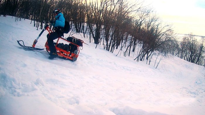 Далее думаю ход моих мыслей понятен. В разговоре в товарищем мы подумали, поскольку низкое давление не влияет ни на аккумуляторы ни на двигатель электрического снегохода это идеальное решение для восхождения в горы. А малые габариты и возможность навесить оборудование вообщем позволяют десантировать на подъемнике до 4,2 км и даже проводить спас работы.