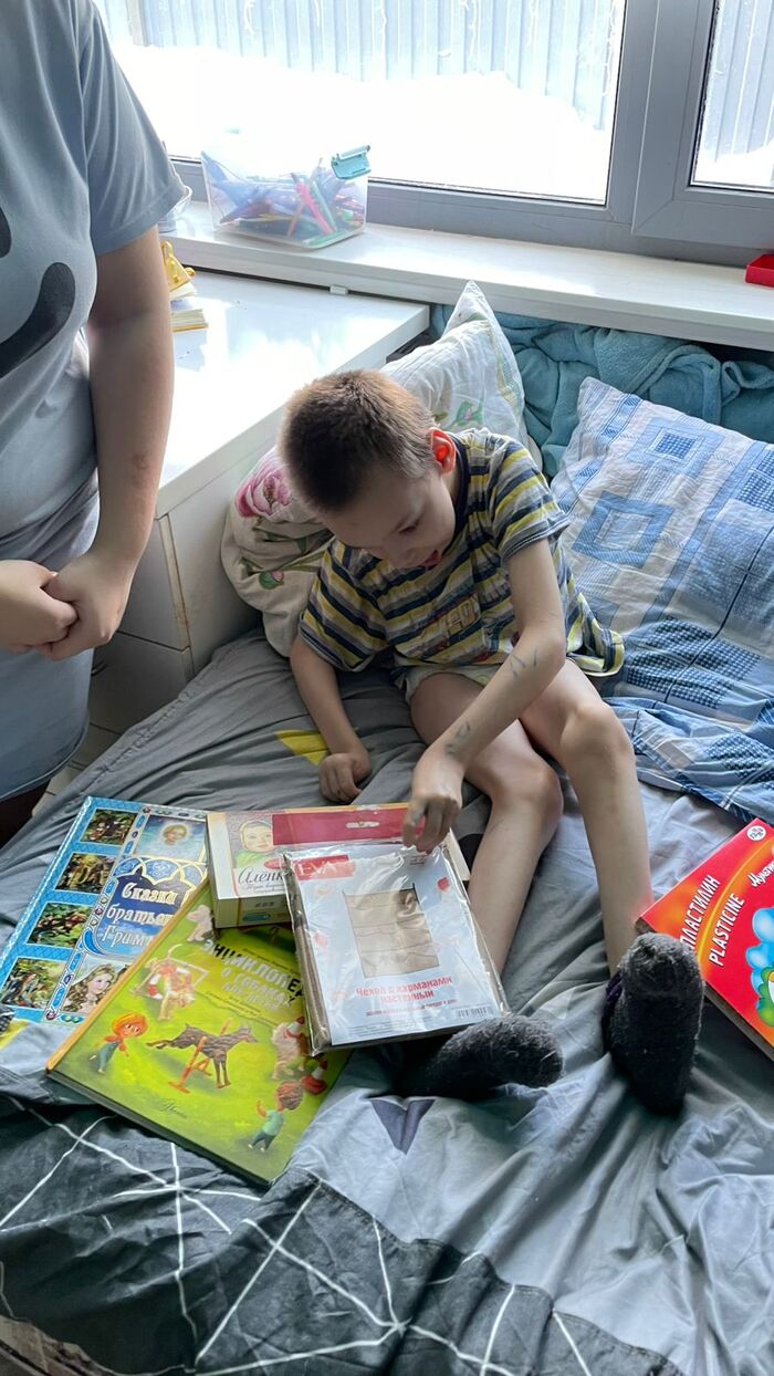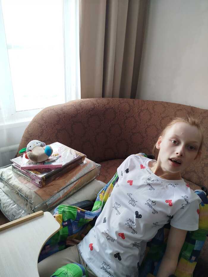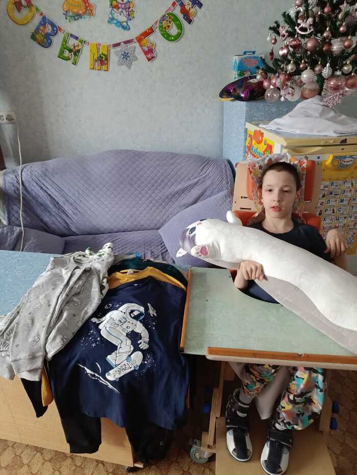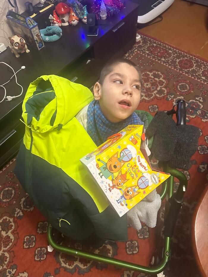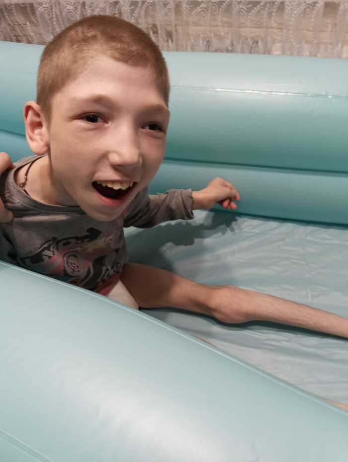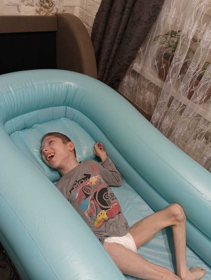 У Миши ДЦП, ему купили надувную ванну, очень удобная вещь. Отец Миши умер, мама заботится о мальчике. Живут в общежитии, раньше искупать ребёнка было большой проблемой. Теперь намного проще