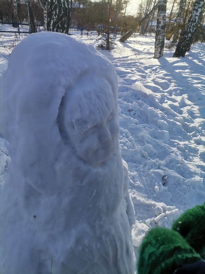Видела, выкладывают тут честно стыренные и искусственно созданные фото снежных фигур. И решила поделиться своим скромным творчеством. Я не скульптор и не художник, леплю для души, потому что руки "чешутся". Греет душу, что такие "снеговики" задерживаются во дворе дольше обычных.