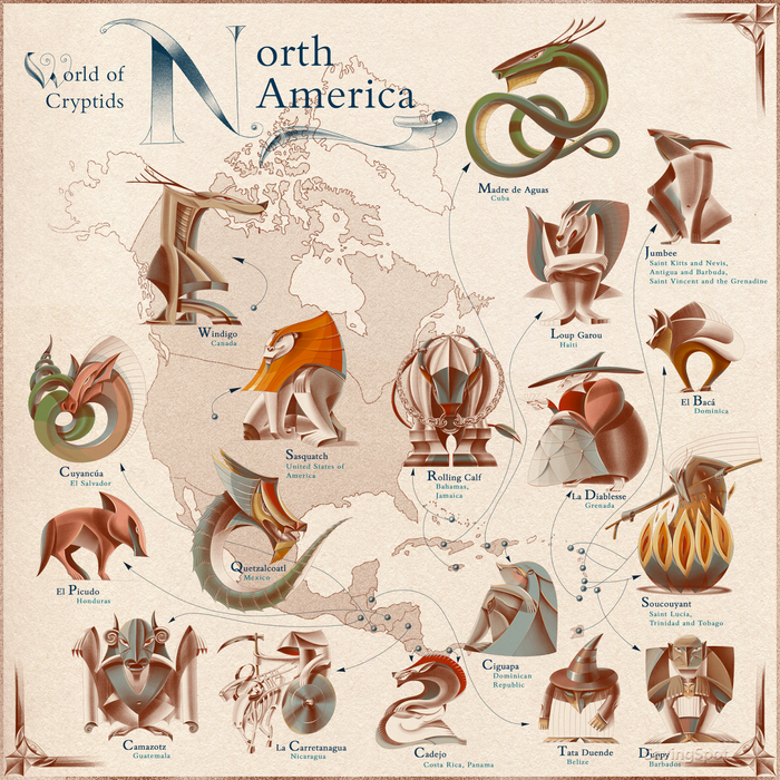 Иллюстратор Лаймуте Варкалайте помогла для создания серии карт, на которых изображены самые известные криптиды в каждой стране на земле: мифические существа, которые отказываются существовать должным образом.