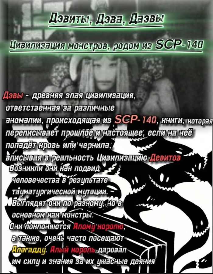 Девиты, Дэва, Даэвы. Цивилизация монстров родом из SCP-140. Дэвы — древняя злая цивилизация, ответственная за различные аномалии, происходящая из SCP-140, книги, которая переписывает прошлое и настоящее, если на неё попадёт кровь или чернила, вписывая в реальность Цивилизацию Девитов. Возникли они как подвид человечества в результате тауматургической мутации. Выглядят они по-разному, но в основном как монстры. Они поклоняются Алому королю, а также очень часто посещают Алагадду. Алый король даровал им силу и знания за их ужасные деяния.