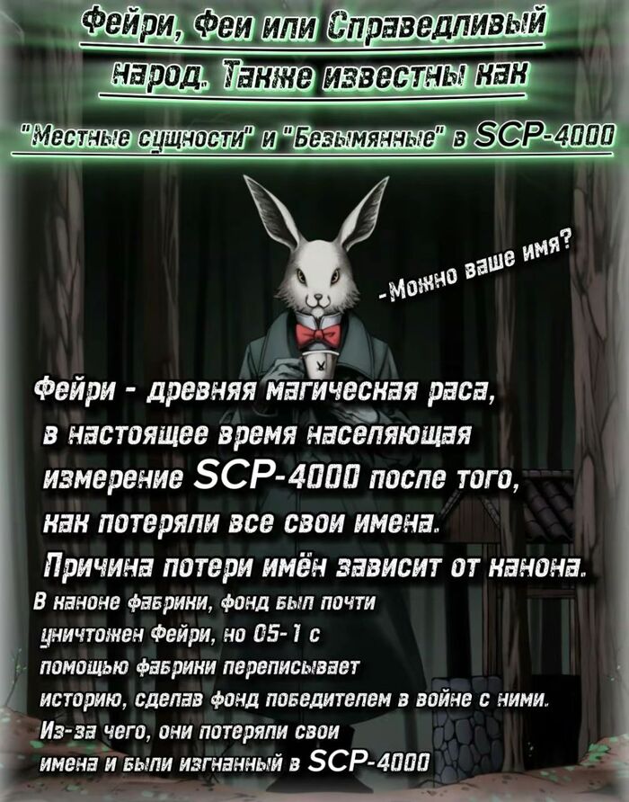 Фейри, Феи, дети звёзд или Справедливый народ. Также известны как «Местные сущности» и «Безымянные» в SCP-4000. Фейри — древняя магическая раса, в настоящее время населяющая измерение SCP-4000 после того, как потеряли все свои имена. Причина потери имён зависит от канона. В каноне Фабрини фонд был почти уничтожен Фейри, но 05-1 с помощью Фабрини переписывает историю, сделав фонд победителем в войне с ними. Из-за чего они потеряли свои имена и были изгнаны в SCP-4000, а в каноне Проекта ПАРАГОН их наказала Титания за то, что те издевались над Детьми ночи. Они самая древняя из рас мира SCP.