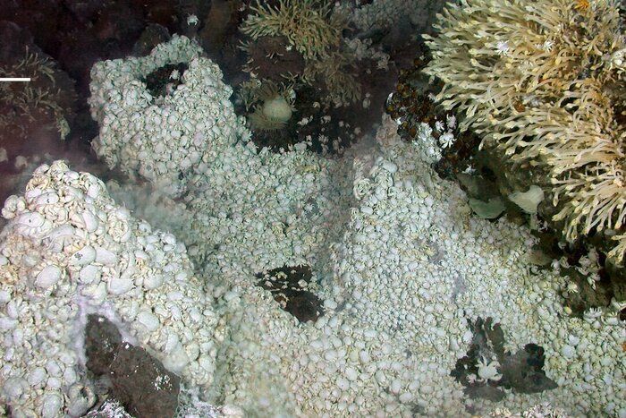 На фото, сделанных глубоководным аппаратом видно, что всё дно вокруг одного из источников буквально покрыто белым ковром из йети.