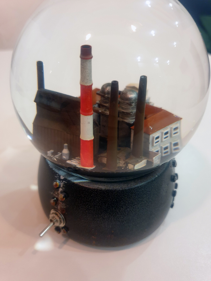 Т.к. "рабочая поверхность" внутри шара 55 мм, решил моделить основной административный корпус с фото приблизив его к геометрически правильному реальному зданию. За зданием разместил технические сооружения (не владею индустриальными знаниями и терминами, поэтому описываю так) и несколько труб: старых (со времен раннего СССР) и новую, всем привычную - бело-красную. А городскую стелу решил разместить на подставке к шару.
