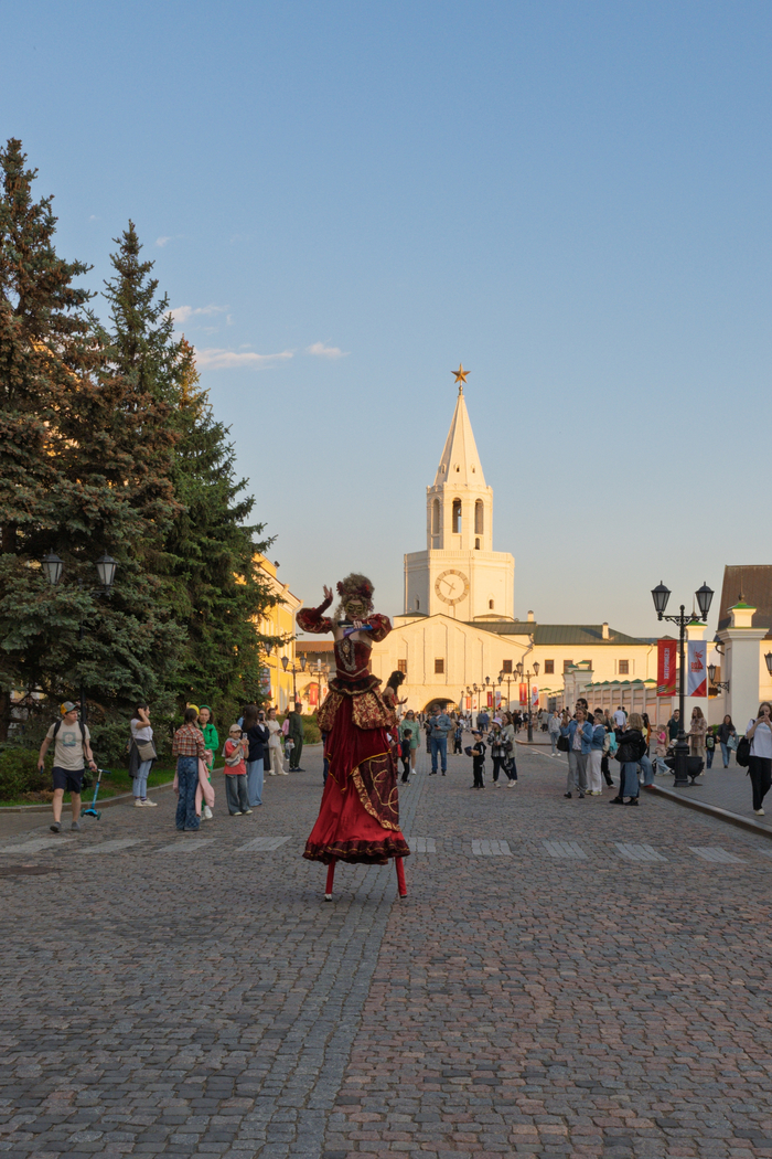 Видел людей, для которых закон всемирного тяготения – просто декорация? В Казани случайно нарвался на настоящих "небожителей" – артистов на ходулях! Шел себе спокойно по Кремлю, снимал исторические стены – как вдруг: толпа ахнула, дети захихикали, а я обернулся и застыл с фотоаппаратом. По мостовой, как по подиуму, шла девушка в сказочном костюме – двухметровая, грациозная, и при этом на ходулях! За ней – еще двое, уже позирующие туристам.