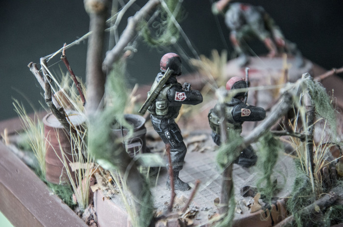 Из-за угла вышла толпа людей, на них были темные кожаные куртки, в руках они держали оружие. Также с ними был ещё один человек, который выделялся на фоне остальных, так как был одет во все зеленое. Его руки были связаны, он был безоружен.