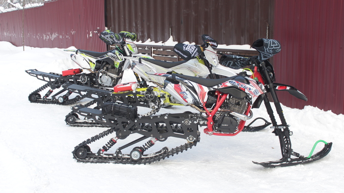 1. Так называемый "плоский". У него гусеничный модуль выглядит плоским, он ставится вместо колеса сзади на маятник вашего мотоцикла.