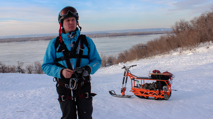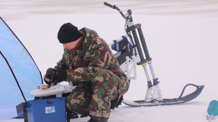 В общем взял друга, оператора и конечно же кучу снаряжения и электрический сноубайк. Снаряжения конечно не куча, но все же много. Там и ящик рыбацкий, и бур для льда и даже палатка на случай ветра.