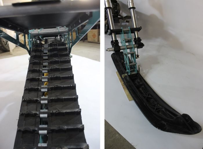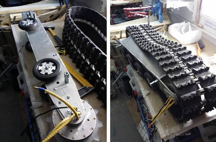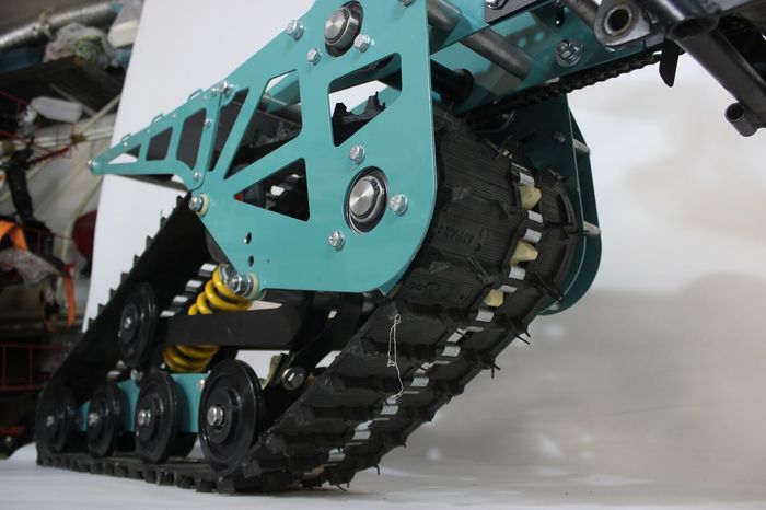 Следующая версия собиралась уже под конкретного клиента. По сути весь комплект разрабатывался с нуля с учетом ошибок и наших пожеланий упростить процесс производства. По большому счету мы пытались скопировать геометрию мировых производителей, но адаптировать под малый мотоцикл с учетом размеров гусеницы.