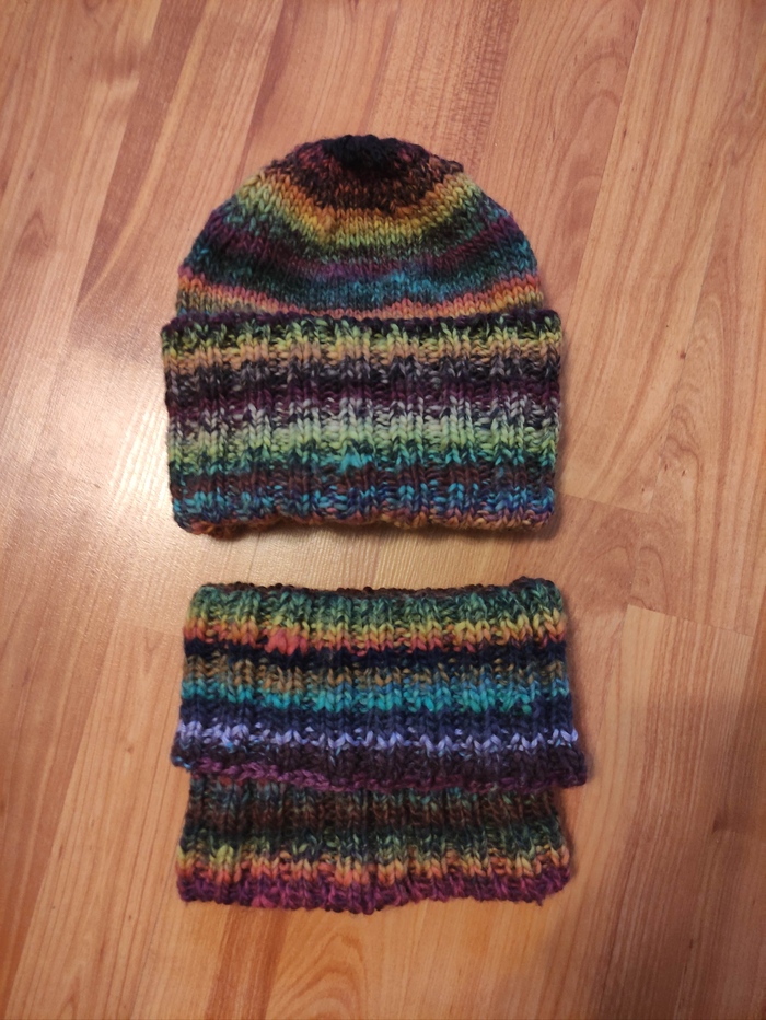 Идея и исполнение мое. Связала спицами из объемной полушерстяной пряжи. Аксессуар легко трансформируется. Можно носить как шапку и как снуд.