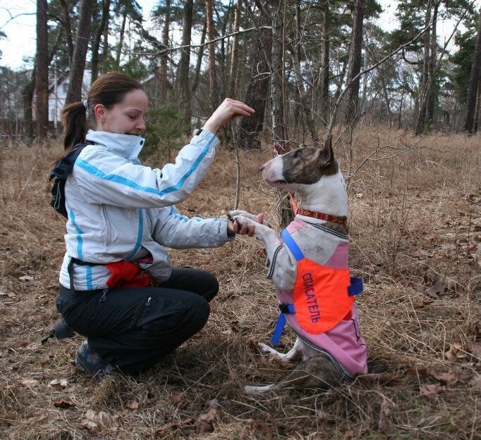Поисковый бультерьер Бусинка. Фото из архива спасателя ПСО Экстремум Анны Савельевой.