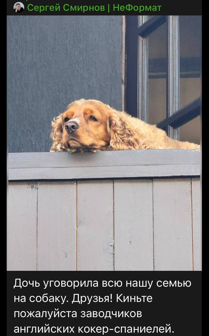 Вечером 3 ноября в блоге у риелтора, автора нескольких книг по недвижимости, эксперта по московским новостройкам Сергея Смирнова появился пост о том, что ему понадобилось приобрести щенка спаниеля для дочери.