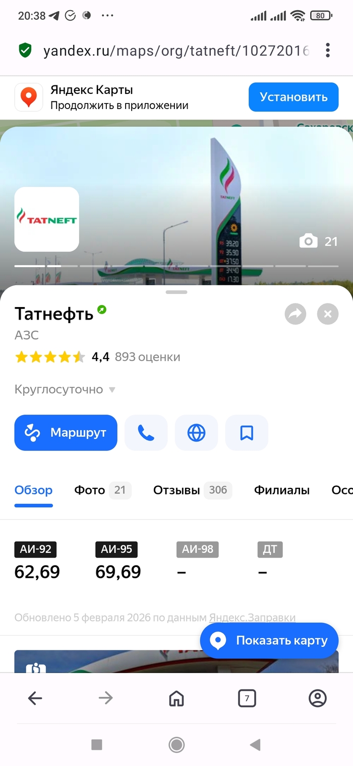 В нём фото из Яндекс-Панорам заправки и ссылка на её расположение. Отслеживалась на ней цена 95 бензина с 2009 года: