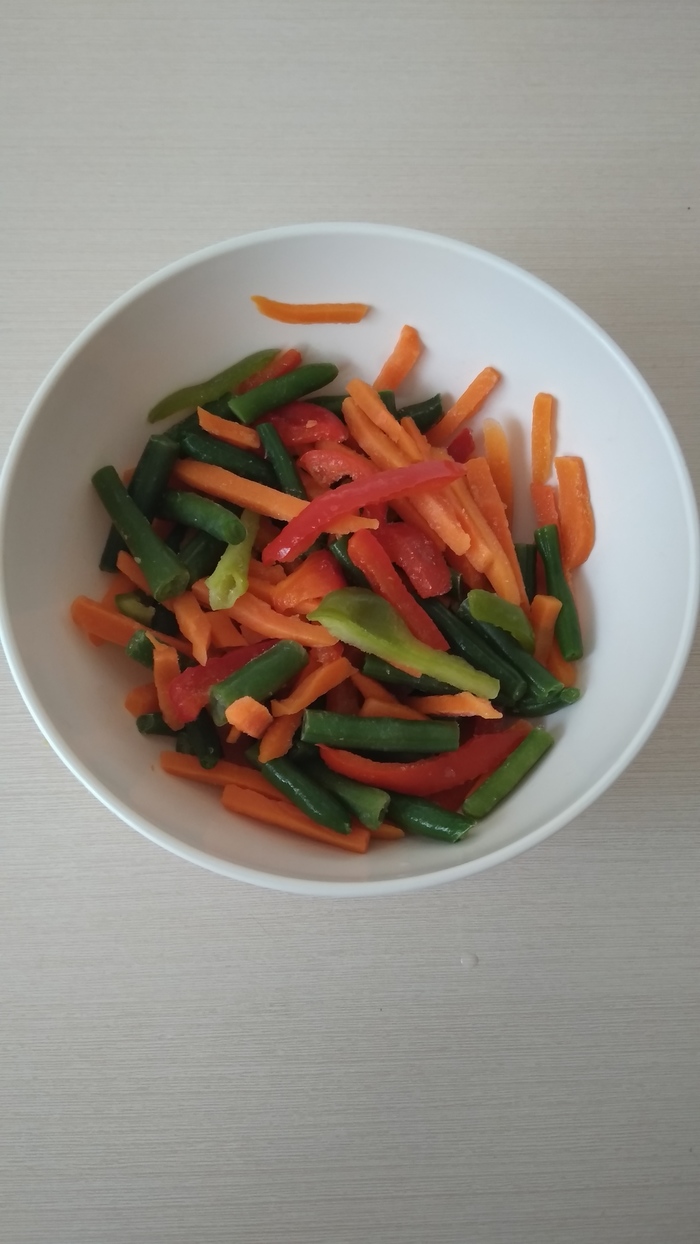- 1 морковь, 1 болгарский перец, немного стручковой фасоли (я заменила их мороженой смесью овощей)