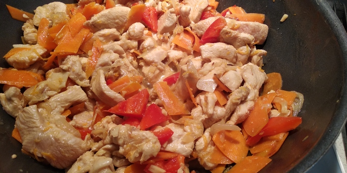Через несколько секунд добавила к ней курочку, чтоб было веселее, перемешала, и через минуту добавила остальные овощи