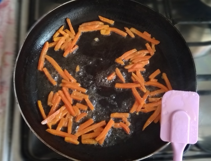 Разогрела сковороду, налила масло, и вперёд, обжаривать морковь